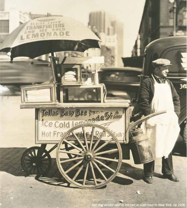 Hot dog vendor next to his cart in rush hour New York, ca 1936
